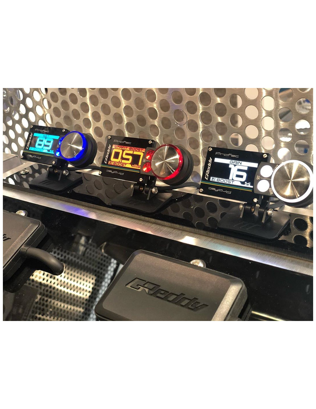 GReddy PRofec Boost Controller Powerful compact and intuitive : the words that perfectly describe the new GReddy PRofec Boost Controller. Its LED screen makes changing settings practical and clear and shows boost pressure in digital display or via different graphic modes. The GReddy PRofec Boost Controller is easily configurable and allows you to obtain required boost pressure thanks to traditional adjustable settings of gain and duty which can be saved in two modes : Lo (low pressure) and Hi (high pressure). Equipped with the latest generation solenoid and with a fast processor the GReddy PRofec guarantees stable boost pressure with extremely quick response and instant activation of the pressure limiter to prevent damage to mechanical parts. Splitting the control screen from the electronic unit GReddy has simplified installation of the PRofec. In total only one thin harness goes from the interior of the vehicle to the engine bay. The screen can be rotated 180° directions and comes with a mounting bracket making it easy to place on or in your dashboard. Features : Easy installation and setup Latest technology components quick and reliable Two memory settings (Lo and Hi) Scramble Boost function (temporary increase of boost pressure activated by a button) Records peaks Programmable alerts with light and sound Configurable boost limiter allowing to reduce boost if high pressure is reached Compatible with internal or external wastegate Withstands up to 2 5 bars of boost