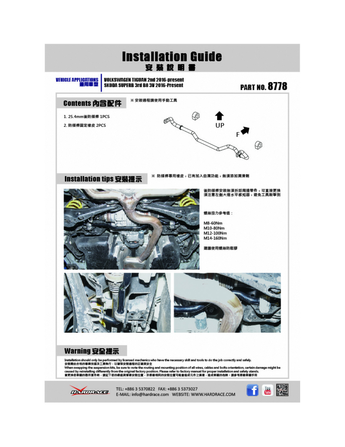 Hardrace Stabilizer Bar for Volkswagen. Ideal for improving driving precision, ride stability and steering response. Manufacturer's Specifications : - 25.4 mm 3 PCS/SET FOR AWD USE * For Skoda Octavia MK3.5 1.8 Use