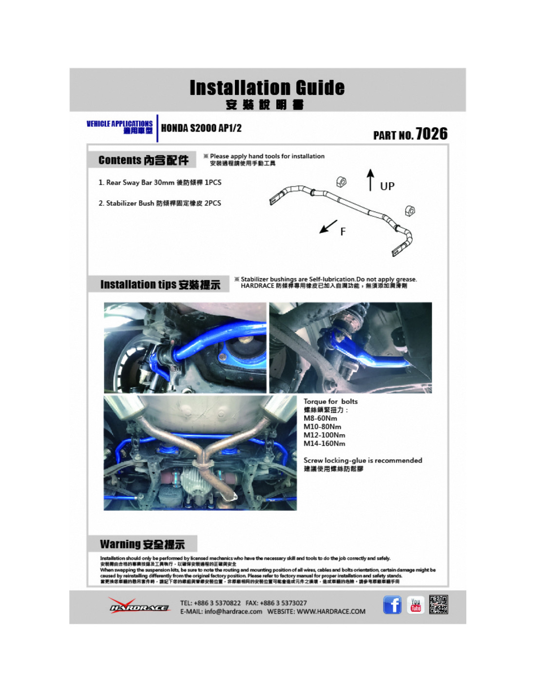 Hardrace stabilizer bar for Honda S2000. Ideal for improving steering precision, stability, and response. Manufacturer's description: - Rear 30 mm Bushing Included 3 PCS/SET