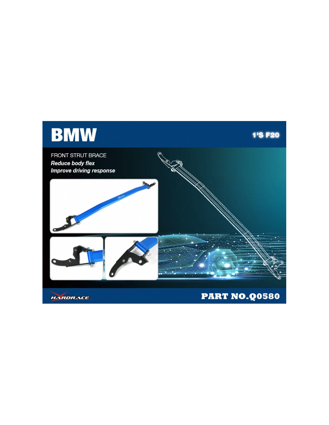 Hardrace strut brace for BMW 1 Series. Ideal for improving steering precision, stability and response. Manufacturer's Description: - 1 PCS/SET FITS 5-HOLES FRONT STRUT For N13/N55 Engines Only