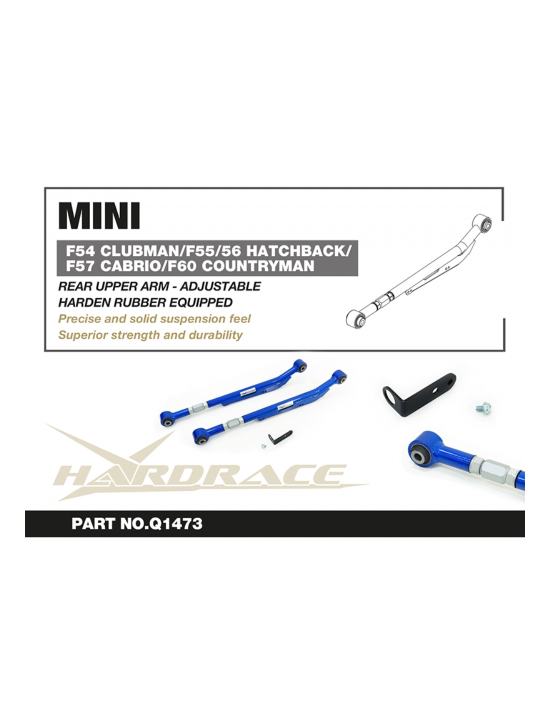 Hardrace Suspension Arm for Mini, BMW. Ideal for improving steering precision, ride stability and response. Manufacturer's Specifications : - Harden Rubber Equipped * Not for 35iXdrive / 2019+ JCW ALL4 Use * Recommend for cars lowered more than 1-inch 3 PCS/SET