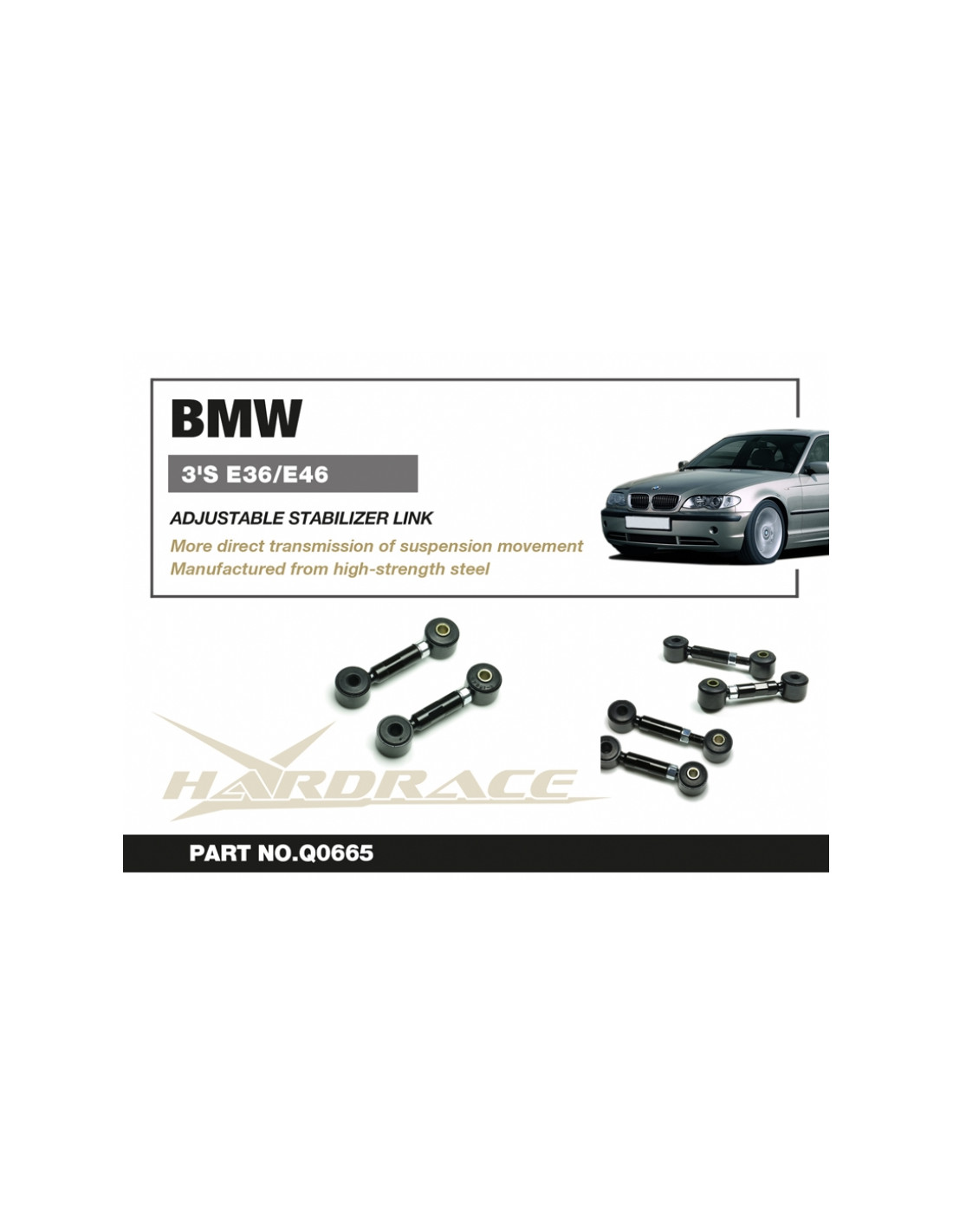 Hardrace Stabilizer Bar Link for BMW 3 Series. Ideal for improving steering precision, ride stability and response. Manufacturer's Specifications : - Range: 91~115mm 2PCS/SET * Not For E36 Compact (Ti) Use * Not For E46 M3 Use
