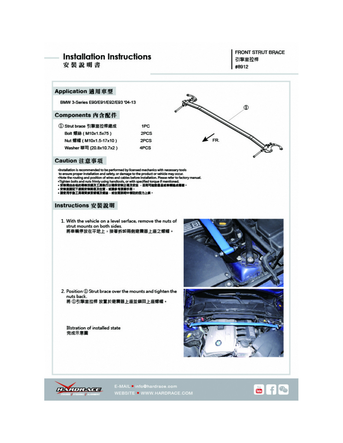 Hardrace strut brace for BMW 3 Series. Ideal for improving driving precision, ride stability and steering response. Manufacturer's Specifications : - * Not For M3 Use 1 PCS/SET