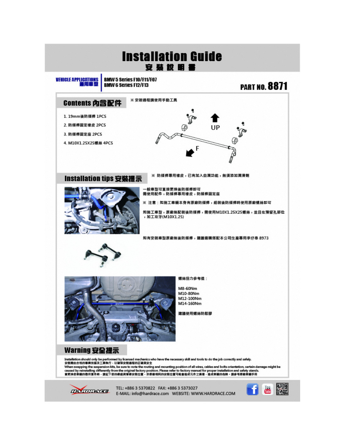 Hardrace Stabilizer Bar for BMW 5 Series, 6 Series. Ideal for improving driving precision, ride stability and steering response. Manufacturer's Specifications : - 19 mm 5 PCS/SET Only for 5'S SEDAN F10 use Only for 6GC F06/F12/13 use Not for M5/M6 use