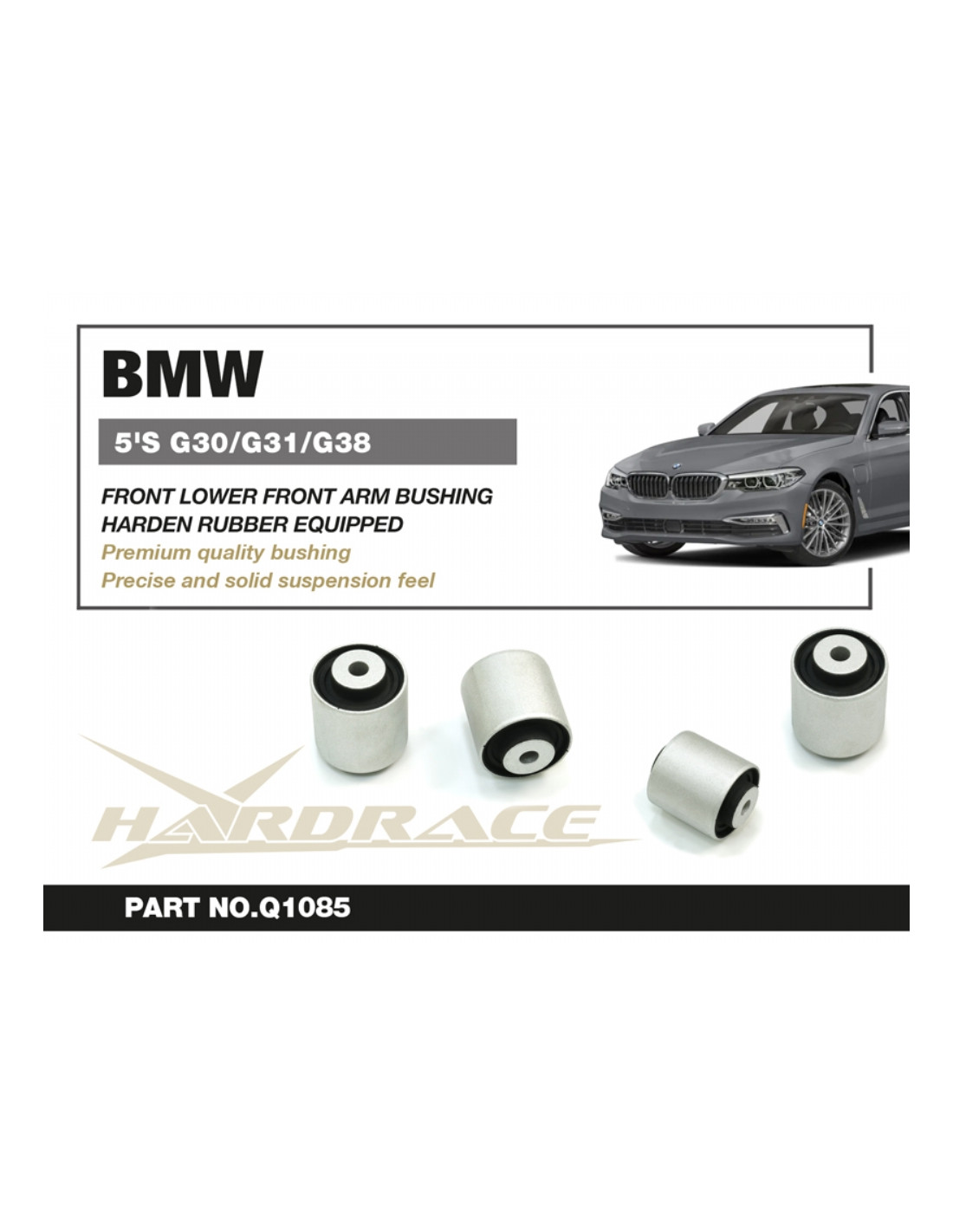 Hardrace silent block for BMW 5 Series. Ideal for improving driving precision, ride stability, and steering response. Manufacturer's specifications : - For RWD & AWD. Use Harden Rubber. Equipped. 2 PCS/SET.