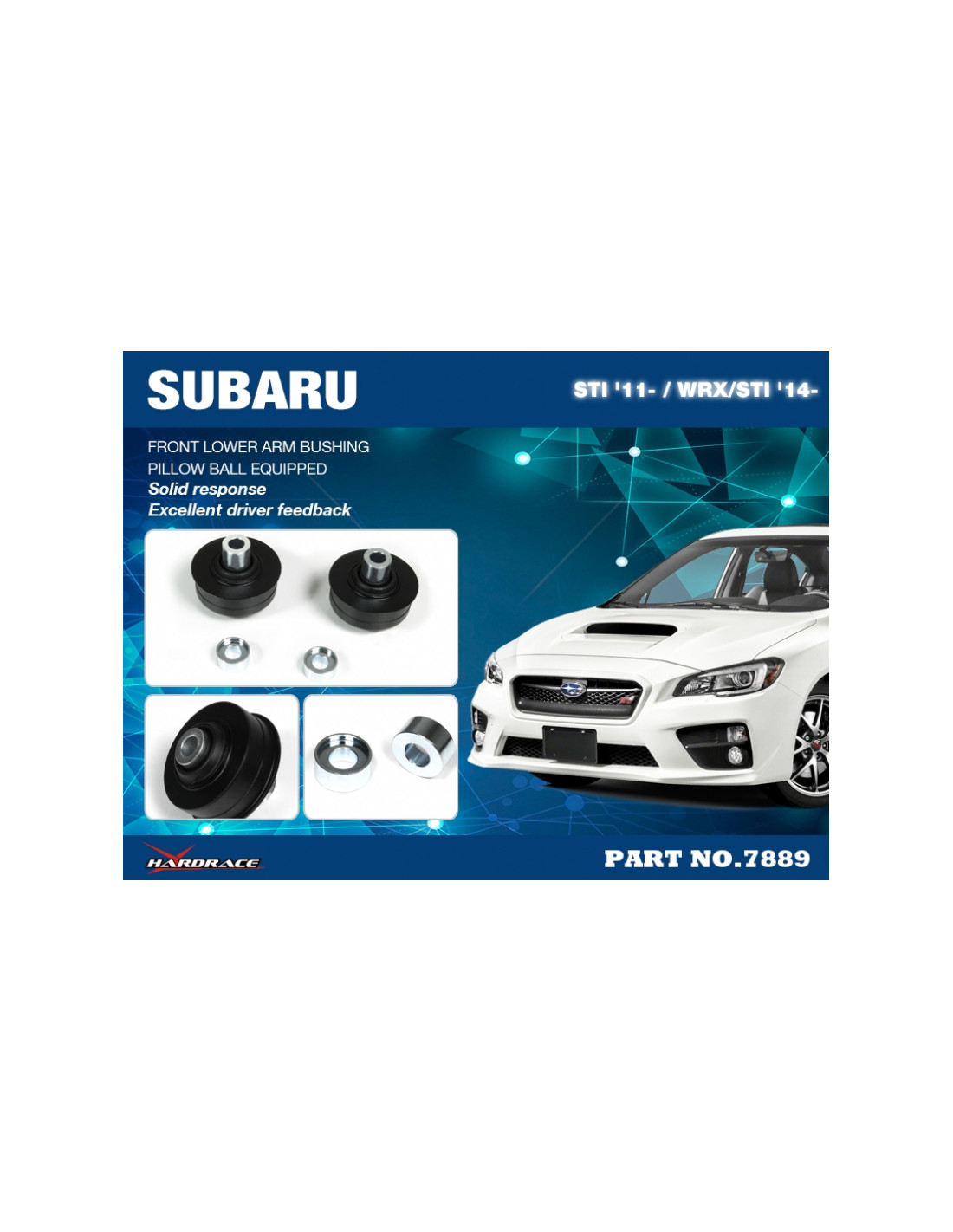 Hardrace silent block for Subaru Impreza, WRX. Ideal for improving driving precision, ride stability and steering response. Features from the manufacturer (original description in English): - Pillow Ball Equipped 2PCS/SET For 2011+ WRX & STI with aluminum control arms use only