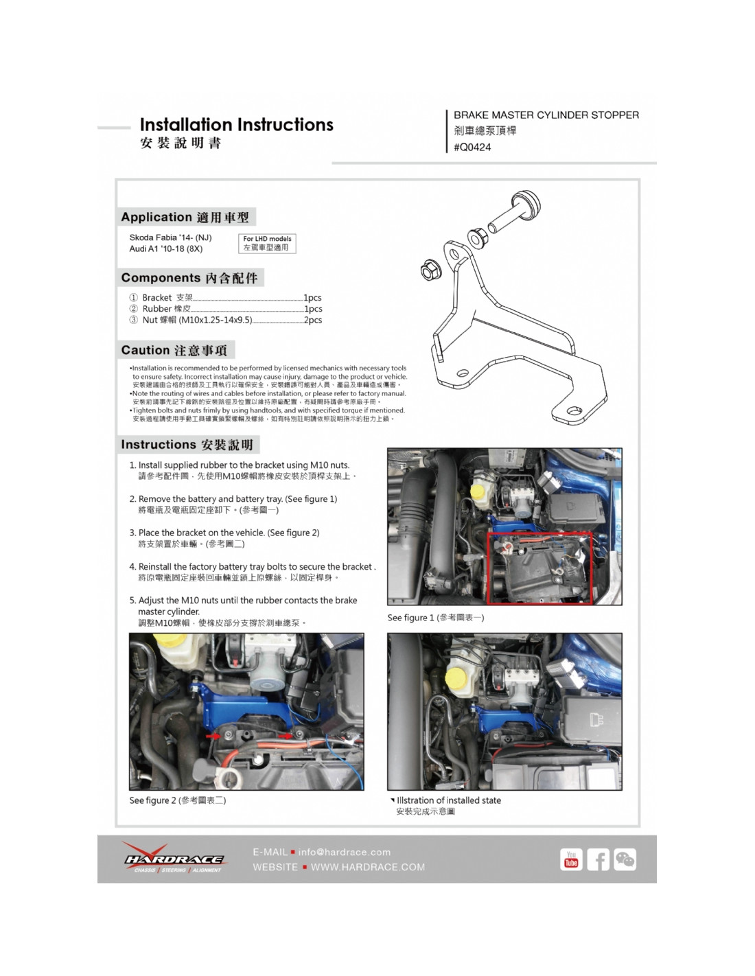 Hardrace strut brace for Audi A1, Skoda Fabia. Ideal for improving driving precision, ride stability and steering response. Manufacturer's specifications : - * For EA211 (1.0T/1.2T/1.4T) Engines Only * For Left-hand Drive Cars Only 1 PCS/SET