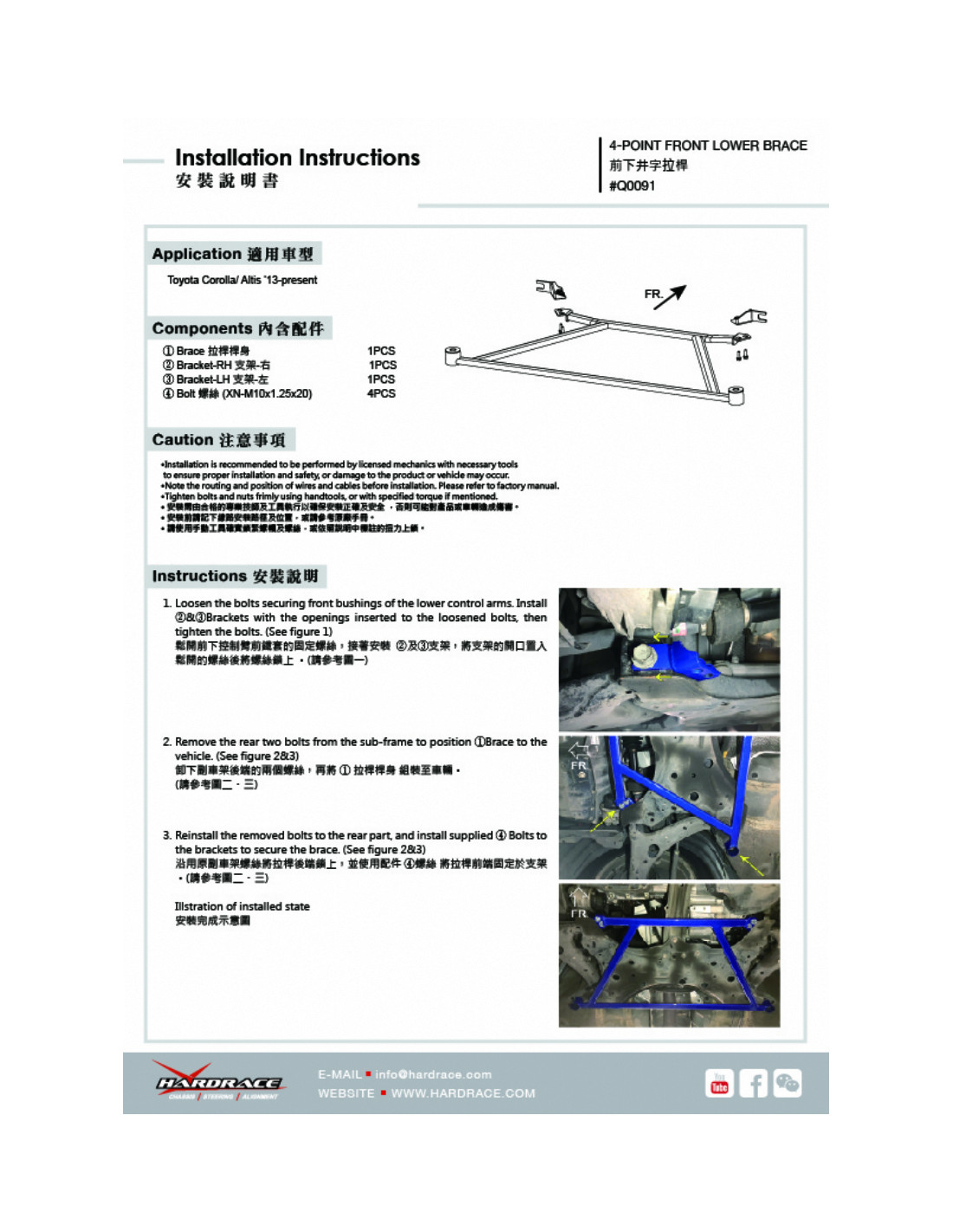 Hardrace strut brace for Toyota Corolla/Altis/Auris. Ideal for improving driving precision, ride stability, and steering response. Manufacturer's specifications : - *For US/TW spec sedan (E170) use only 3 PCS/SET