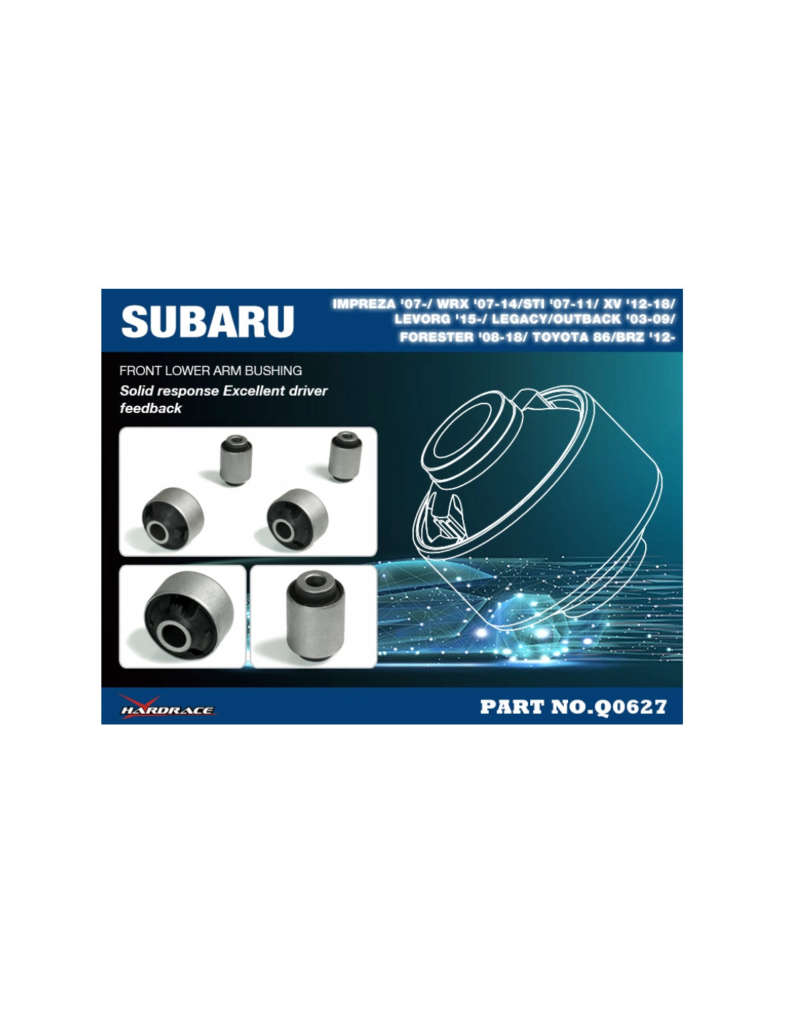 Hardrace silent block for Scion, Subaru, Toyota. Ideal for improving driving precision, trim stability and steering response. Features from the manufacturer (original description in English): - Harden Rubber Equipped. 4 PCS/SET *Street Version *Not for 2011-2014 STI with aluminum control arms