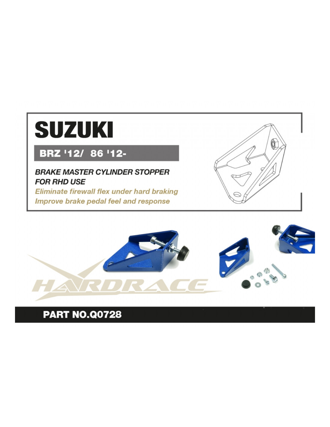 Hardrace strut brace for Subaru BRZ, Toyota 86. Ideal for improving driving precision, ride stability and steering response. Manufacturer's specifications : - * For RHD Use Only Available Colors: Blue / ED coated Black 1 PCS/SET