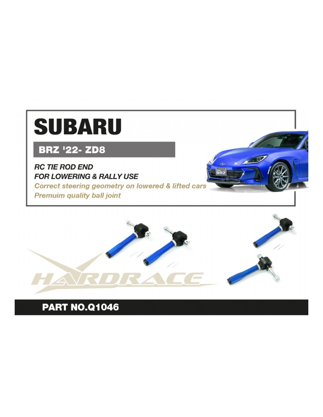 RC Hardrace tie rod end for Subaru BRZ. Ideal for improving driving precision, trim stability, and steering response. Manufacturer's specifications : - For lift and lowering use. Pillow ball equipped. 2 pcs/set.