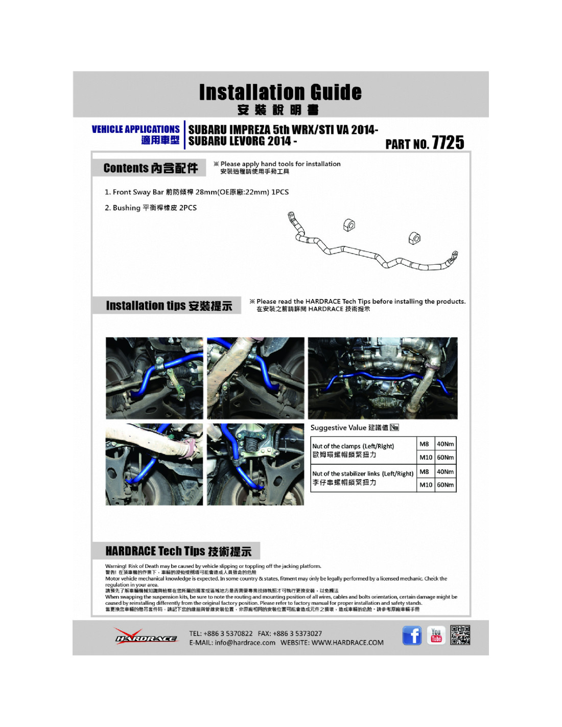 Hardrace Stabilizer Bar for Subaru Levorg, WRX. Ideal for improving driving precision, ride stability and steering response. Manufacturer's Specifications : - 28mm 3 PCS/SET *** For WRX FA Engine Use Only *** Not for STI EJ25