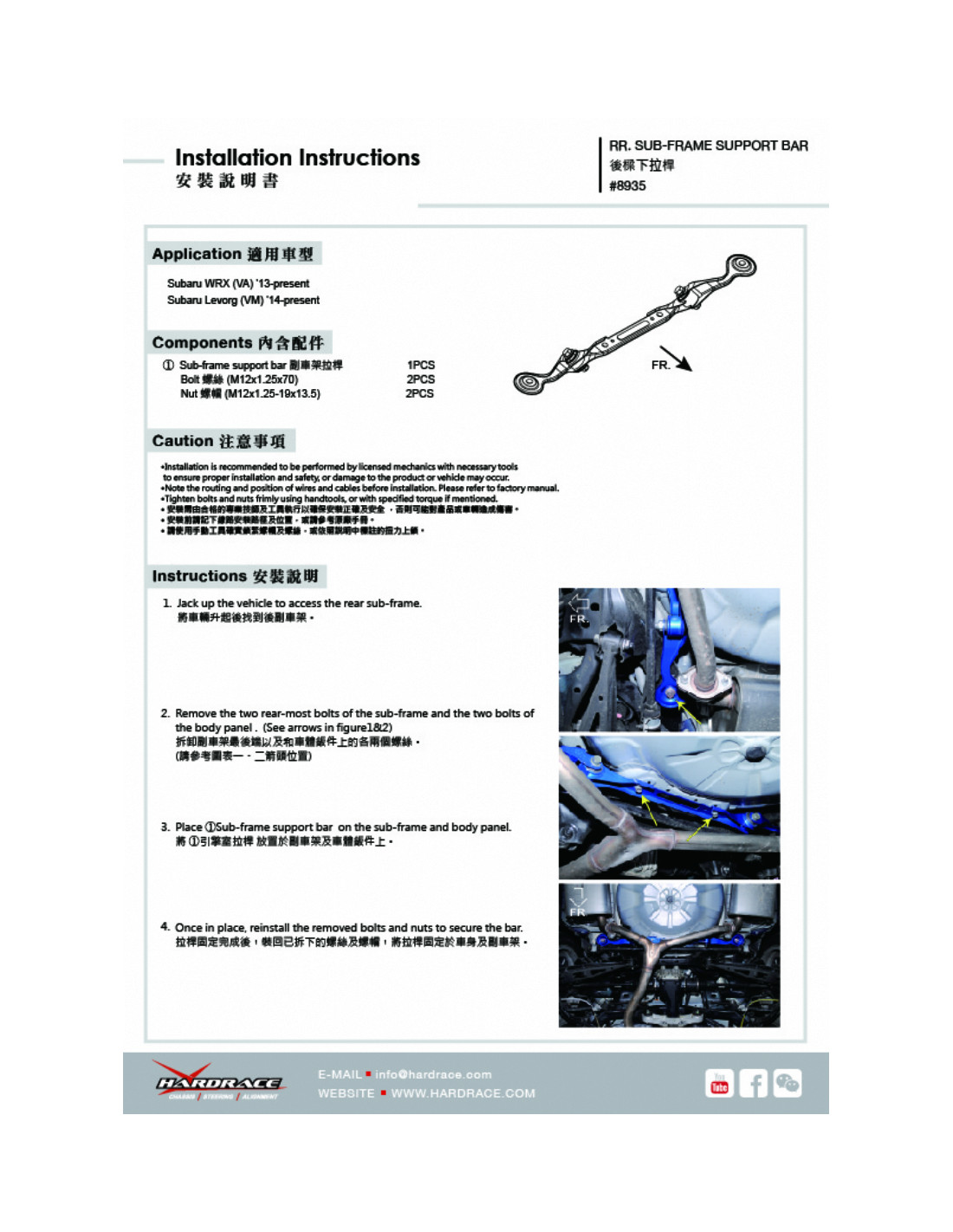 Hardrace strut brace for Subaru Levorg, WRX. Ideal for improving driving precision, ride stability, and steering response. Manufacturer's Specifications : - 1 PCS/SET
