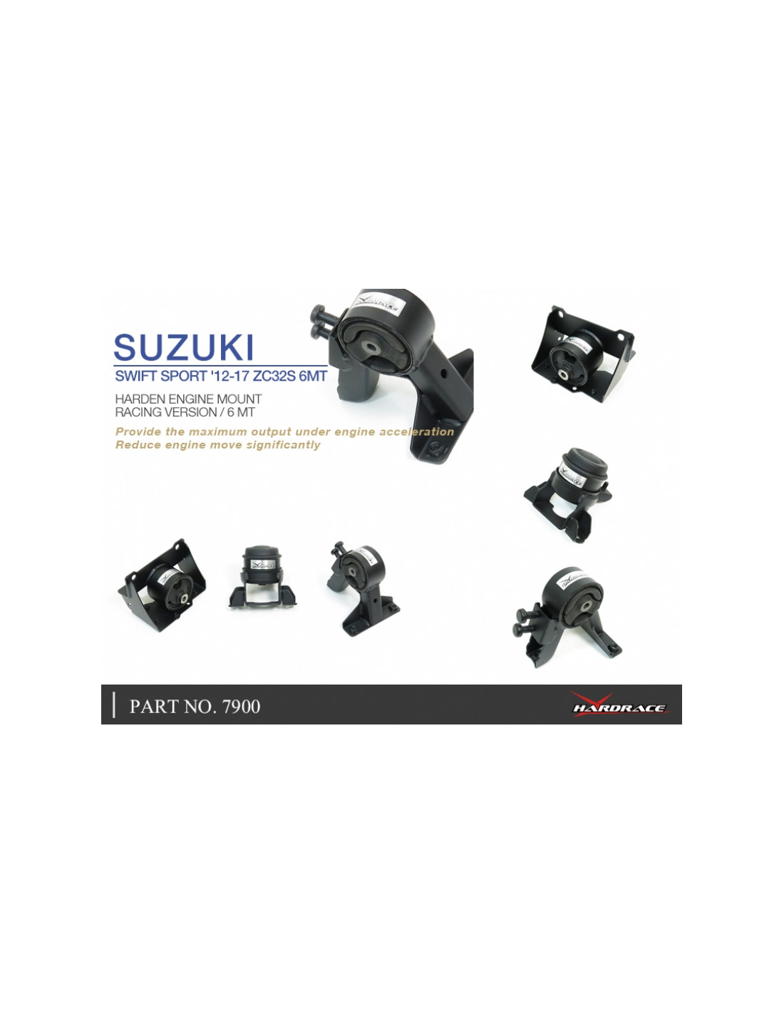 Hardrace engine mount for Suzuki Swift. Ideal for improving driving precision, trim stability and steering response. Features from the manufacturer (original description in English): - *For Japan-built cars only 3 PCS/SET RACE VERSION FOR '12-17 ZC32S 6MT USE