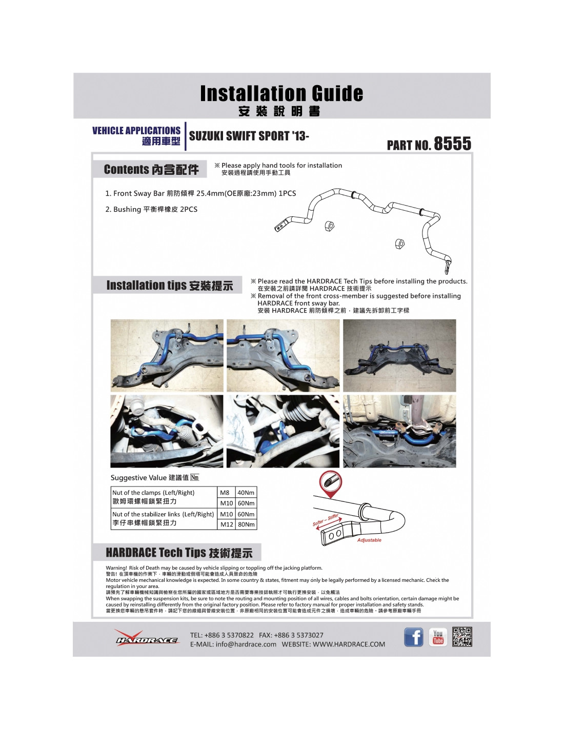 Hardrace Stabilizer Bar for Suzuki Swift. Ideal for improving steering precision, stability, and response. Manufacturer's Specifications : - 3 PCS/SET HARDRACE: 25.4 mm OE: 23 mm * FOR 1.6 L ZC32S