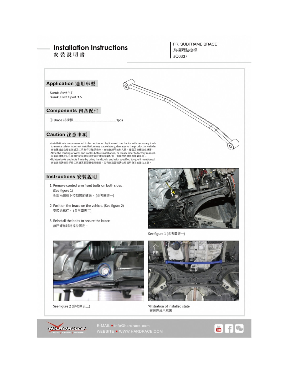 Hardrace strut brace for Suzuki Swift. Ideal for improving steering precision, stability, and response. Manufacturer's specifications : - Does not fit Sport 1.4T Hybrid. 1 PCS/SET.