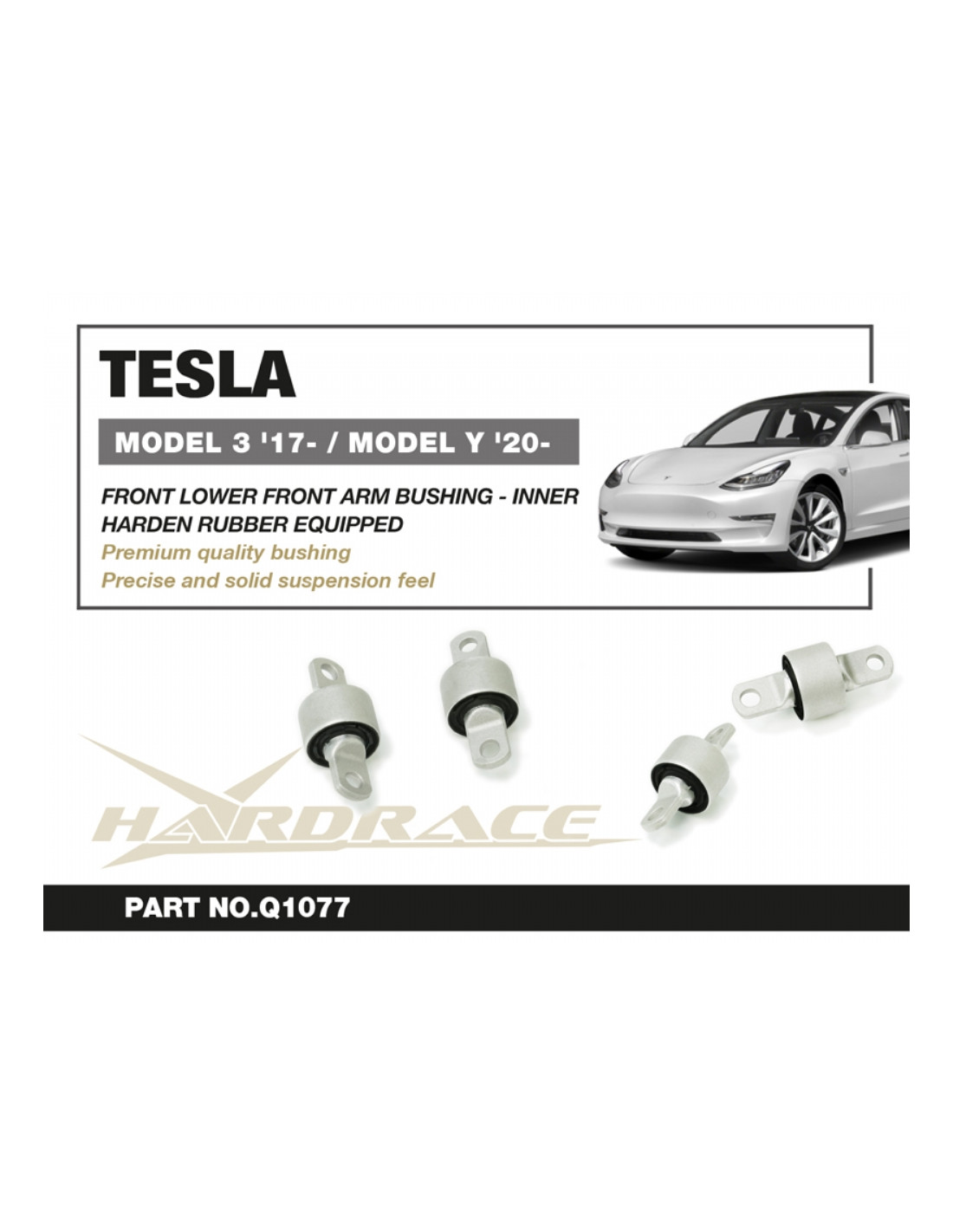Hardrace silent block for Front Lower Front Arm Bushing - Inner Tesla Model 3, Model y. Ideal for improving driving precision, trim stability and steering response. Features from the manufacturer (original description in English): - Harden Rubber Equipped 2 PCS/SET