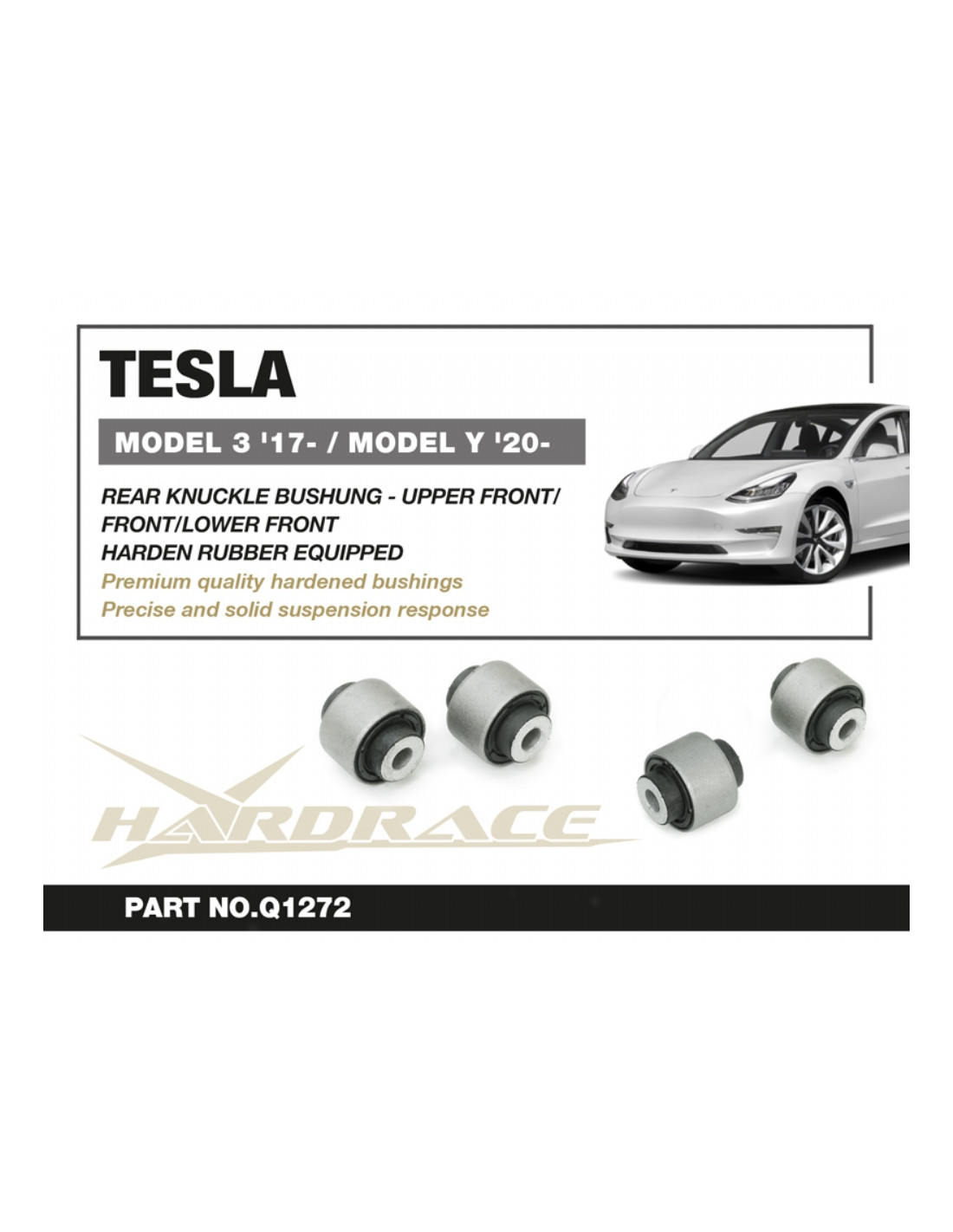 Hardrace Rear Knuckle Bushing - Upper Front/Front/Lower Front for Tesla Model 3, Model Y. Ideal for improving steering precision, stability, and response. Manufacturer's Description: - Harden Rubber Equipped Connect To Upper Front / Toe / Trailing Arms 2 PCS/SET
