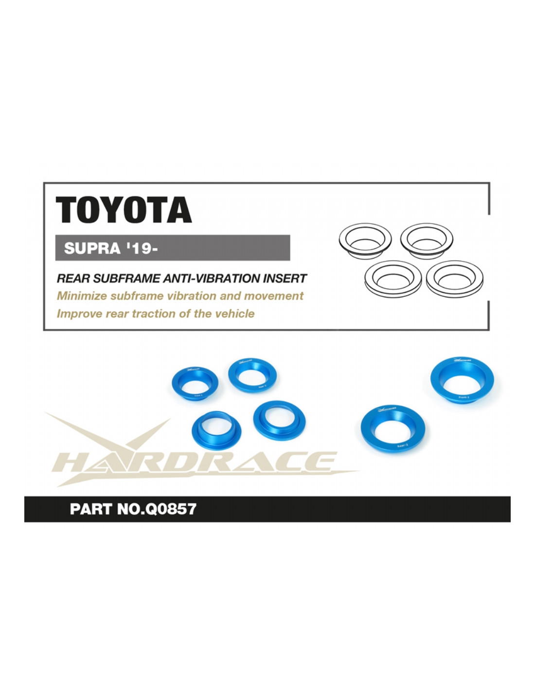 Hardrace silent block for Toyota Supra. Ideal for improving steering precision, stability, and response. Manufacturer's specifications : - 4 PCS/SET