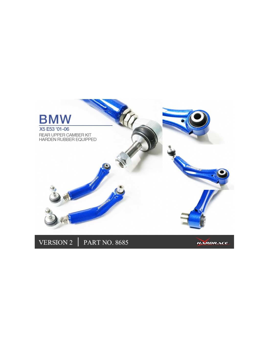 Hardrace suspension arm for BMW X5. Ideal for improving steering precision, stability, and response. Manufacturer's description: - Harden Rubber Equipped. 2 PCS/SET Version 2.