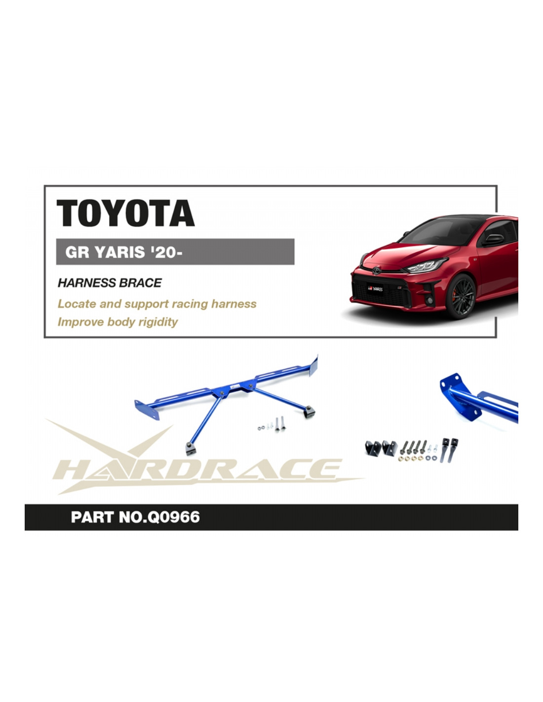 Hardrace strut brace for Toyota Yaris / Vitz. Ideal for improving driving precision, ride stability, and steering response. Manufacturer's specifications : - 3 PCS/SET