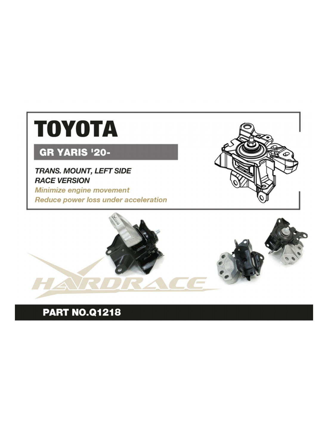 Hardrace engine mount for Toyota Yaris / Vitz. Ideal for improving driving precision, ride stability and steering response. Manufacturer's specifications : - Race Version For 1.6T AWD (GXPA16) Only 1 PCS/SET