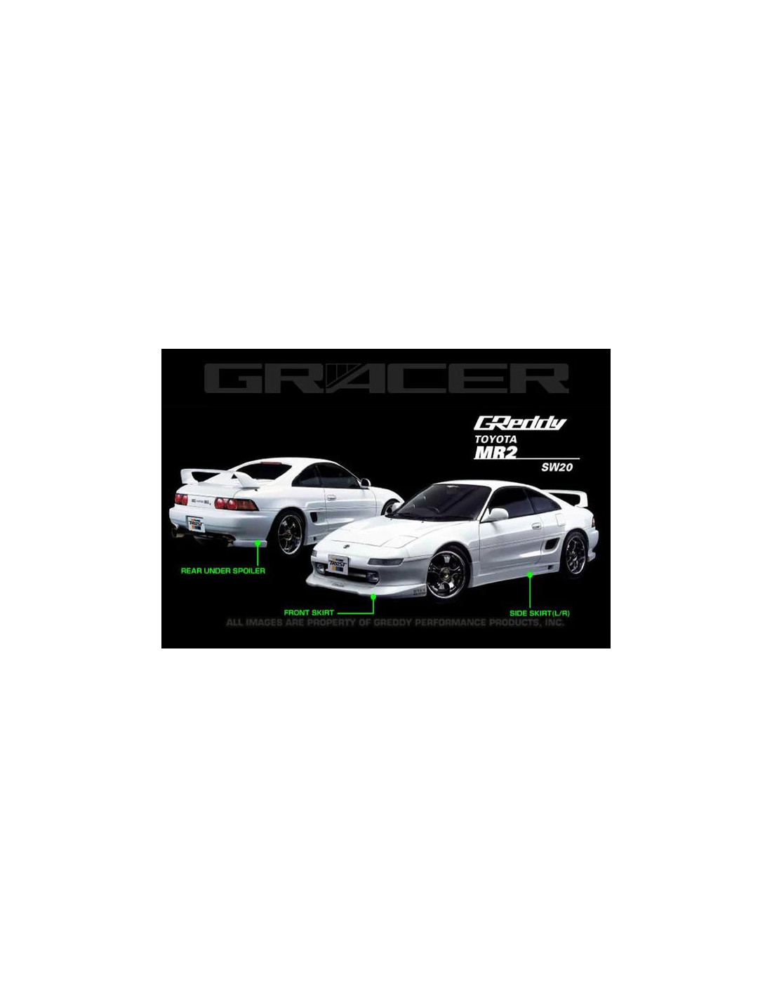 Look agressif pour votre MR2 SW20Compatibles Toyota MR2 SW20 (1990-1996)Bas de caisse en fibre de verre renforcée (FRP)Ajustement parfaitFabriqués au Japon finition sans faillesS’installent sans modificationAméliorent l’aérodynamismetMontage simple et rapide Spécifications des Bas de Caisse GReddy GRacer pour Toyota MR2 SW20Fabriqués au Japon par GReddy ces bas de caisse en fibre de verre renforcée (FRP) bénéficient d'un ajustement sans failles tout en étant très robustes. En plus d'apporter une touche d'agressivité discrète ils améliorent l'aérodynamisme en favorisant l'écoulement du flux d'air sur les côtés de l'auto.Ces bas de caisse prêts à peindre s’installent sur les MR2 SW20 de 1990 à 1996 sans aucune modification. Montage simple et rapide pour un look sportif sans fioritures !
