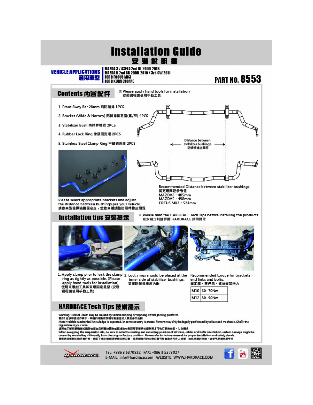 Barra stabilizzatrice Hardrace per Ford Focus, Mazda 3, 5. Ideale per migliorare la precisione di guida, la stabilità dell'assetto e la risposta dello sterzo. Caratteristiche dal produttore : - 28 mm 11 PCS/SET