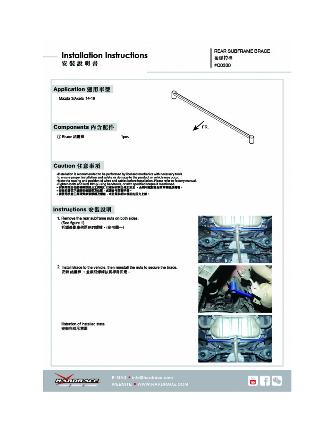 Barra rinforzo Hardrace per Mazda 3. Ideale per migliorare la precisione di guida, la stabilità dell'assetto e la risposta dello sterzo. Caratteristiche dal produttore : - 1 PCS/SET