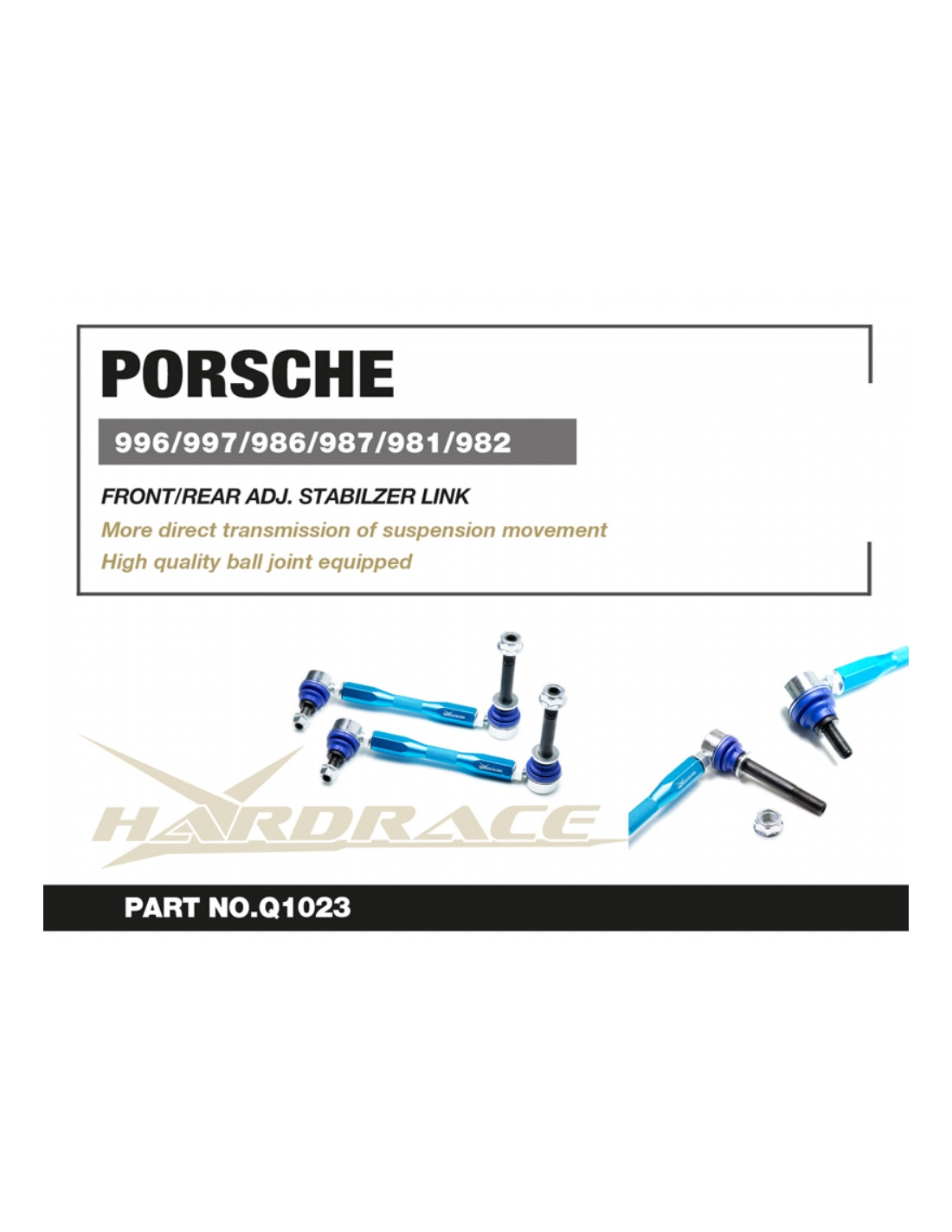 - - Adj. Stabilizer Link Porsche 911, Boxster / cayman Note: - Ricambio specifico per i modelli indicati (verificare sempre il codice Hardrace prima dell'ordine) - Si consiglia il montaggio in officina specializzata - Prodotto adatto a uso stradale e sportivo