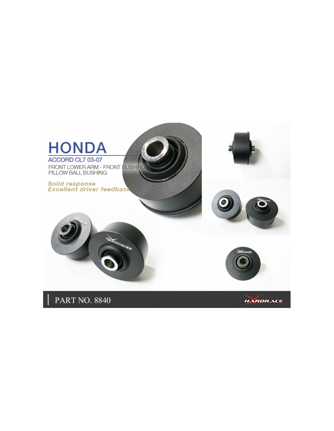Silent block Hardrace per Honda Accord. Ideale per migliorare la precisione di guida, la stabilità dell'assetto e la risposta dello sterzo. Caratteristiche dal produttore : - Pillow Ball Equipped. 2 PCS/SET Front lower / Big Bushing