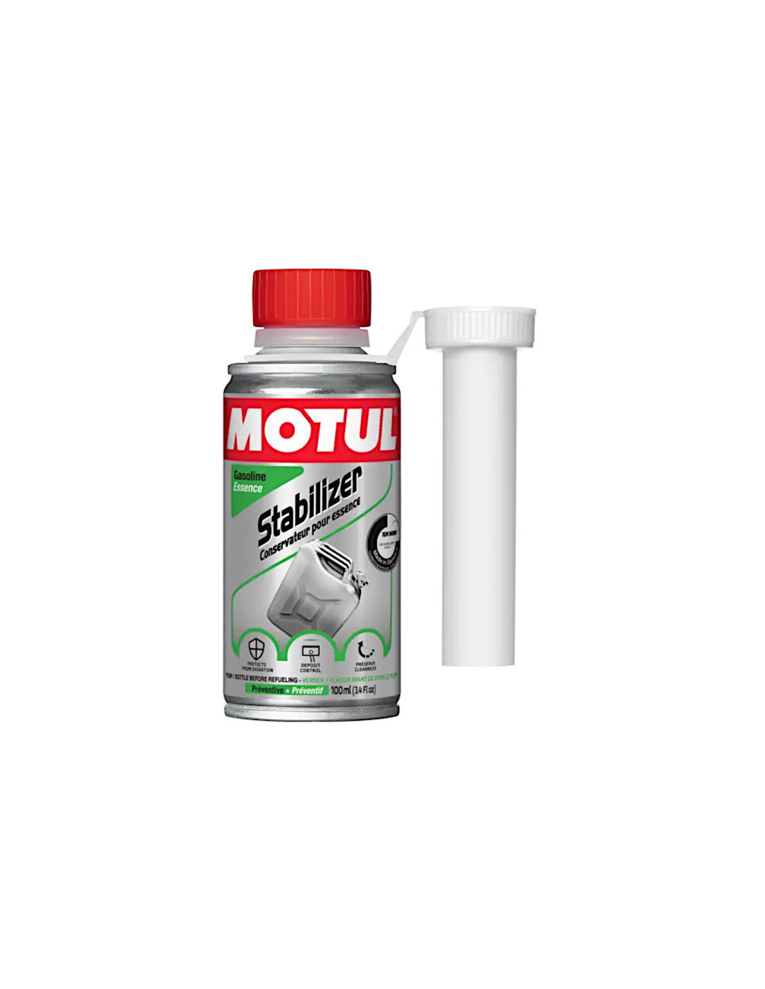 Proteggi il tuo carburante durante lo stoccaggioProtegge il carburante dall'ossidazioneProtegge il motore dalla corrosionePulisce i sistemi di iniezione e i carburatoriPreviene e rimuove i depositi sulle valvoleCompatibile con tutti i tipi di benzinaAdatto ai convertitori cataliticiConfezione: bomboletta da 100 mlAdditivo per la conservazione del carburante Motul StabilizerMotul Stabilizer è un additivo da aggiungere alla benzina per garantirne la protezione durante lo stoccaggio a lungo termine. La sua formula completa consente:Protezione dall'ossidazione, prevenendo la formazione di depositi e facilitando i riavvii dopo lo stoccaggio.Pulisce i depositi nelle camere di combustione dei carburatori e nelle valvole per ottenere prestazioni ottimali del motore.Sebbene sia stato progettato per le auto, questo additivo è adatto a tutti i motori, come quelli marini, delle moto o delle motoslitte. Lo stabilizzatore è compatibile con benzina senza piombo o con piombo, compresi i convertitori catalitici. Consigli per l'uso: Avvitare l'imbuto in dotazione sulla tanica metallica e versare la dose appropriata nella benzina da trattare (vedere sotto). Se il veicolo è rimasto fermo, lasciare il motore al minimo per alcuni minuti per far circolare il carburante prima di aggiungerlo. Dosaggio: Dosaggio preventivo: 100 ml per un massimo di 50 litri di carburante.