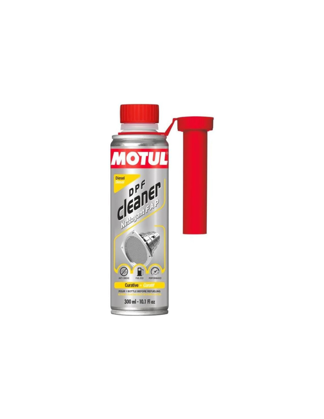 Pulitore per filtri antiparticolato dieselPulisce il filtro antiparticolatoAgisce in modo rapido ed efficaceRipristina potenza e prestazioni originaliRiduce il consumo di carburante e le emissioniAiuta a mantenere l'affidabilitàUso preventivo: ogni 5000 kmUso curativo: 1 lattina in 20 litri di gasolioSpecifiche del pulitore DPF Motul Questo pulitore per filtri antiparticolato è adatto a tutti i tipi di motore diesel. Sicuro e facile da usare, accelera la rigenerazione del DPF e lo mantiene pulito. La sua azione prolunga la durata del DPF rendendo il motore più affidabile aumentando la potenza (miglioramento del minimo all'avviamento e dell'accelerazione) e riducendo il consumo di carburante e le emissioni. Per il trattamento curativo (sul cruscotto: spia DPF accesa) versare l'intera bottiglia in 20 litri di gasolio. Per l'uso preventivo versare l'intera bottiglia in 40 litri di gasolio e ripetere l'operazione ogni 5000 km.