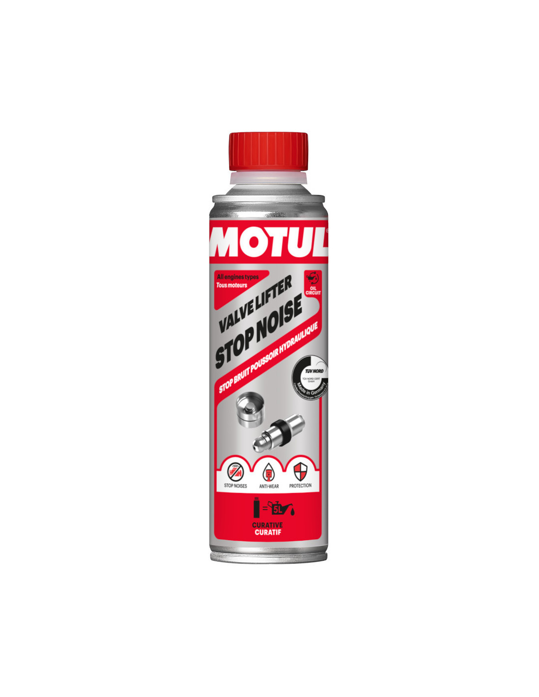 Motul Valve Lifter Stop Noise Migliora le proprietà antiusura e ad alta pressione dell'olio motore Elimina i rumori di vibrazione delle punterie idrauliche Protegge le valvole e il sistema di distribuzione Tratta fino a 5 litri di olio motore Compatibile con qualsiasi olio minerale o sintetico Confezione: flacone da 300 ml Specifiche di Motul Valve Lifter Stop Noise Motul Valve Lifter Stop Noise è un additivo per olio motore che migliora le proprietà antiusura e ad alta pressione del lubrificante per eliminare i rumori di vibrazione delle punterie idrauliche e ottimizzarne il funzionamento. Protegge inoltre le valvole e il sistema di distribuzione limitandone l'usura, riducendone la rumorosità e aumentandone la durata. Questo additivo è adatto a tutti i motori a benzina o diesel dotati di punterie idrauliche e deve essere aggiunto all'olio motore caldo. Una dose da 300 ml tratta fino a 5 litri di olio. Controllare il livello dell'olio prima dell'uso.