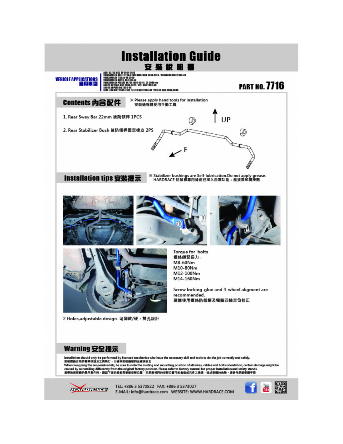 Barra stabilizzatrice Hardrace per Audi, Seat, Skoda, Volkswagen. Ideale per migliorare la precisione di guida, la stabilità dell'assetto e la risposta dello sterzo. Caratteristiche dal produttore : - 22 mm 3 PCS/SET * ONLY FIT FWD CAR