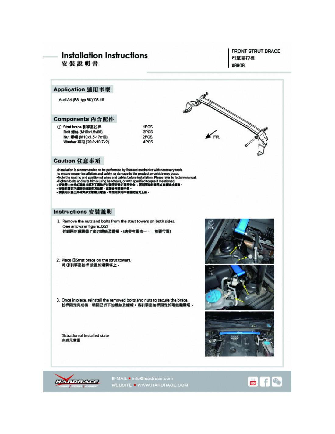 Barra rinforzo Hardrace per Audi A4. Ideale per migliorare la precisione di guida, la stabilità dell'assetto e la risposta dello sterzo. Caratteristiche dal produttore : - *For '08-12 models only. 1 PCS/SET