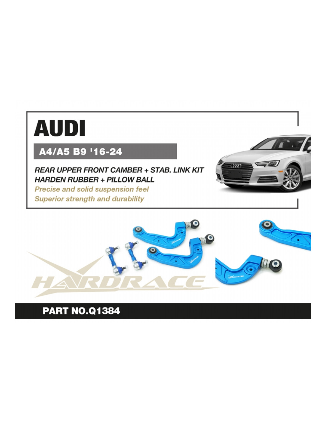 Braccio sospensione Hardrace per Audi A4, A5, S4/RS4, S5/RS5. Ideale per migliorare la precisione di guida, la stabilità dell'assetto e la risposta dello sterzo. Caratteristiche dal produttore : - Pillow Ball + Harden Rubber Bushings Stabilizer End Link Included 4 PCS/SET