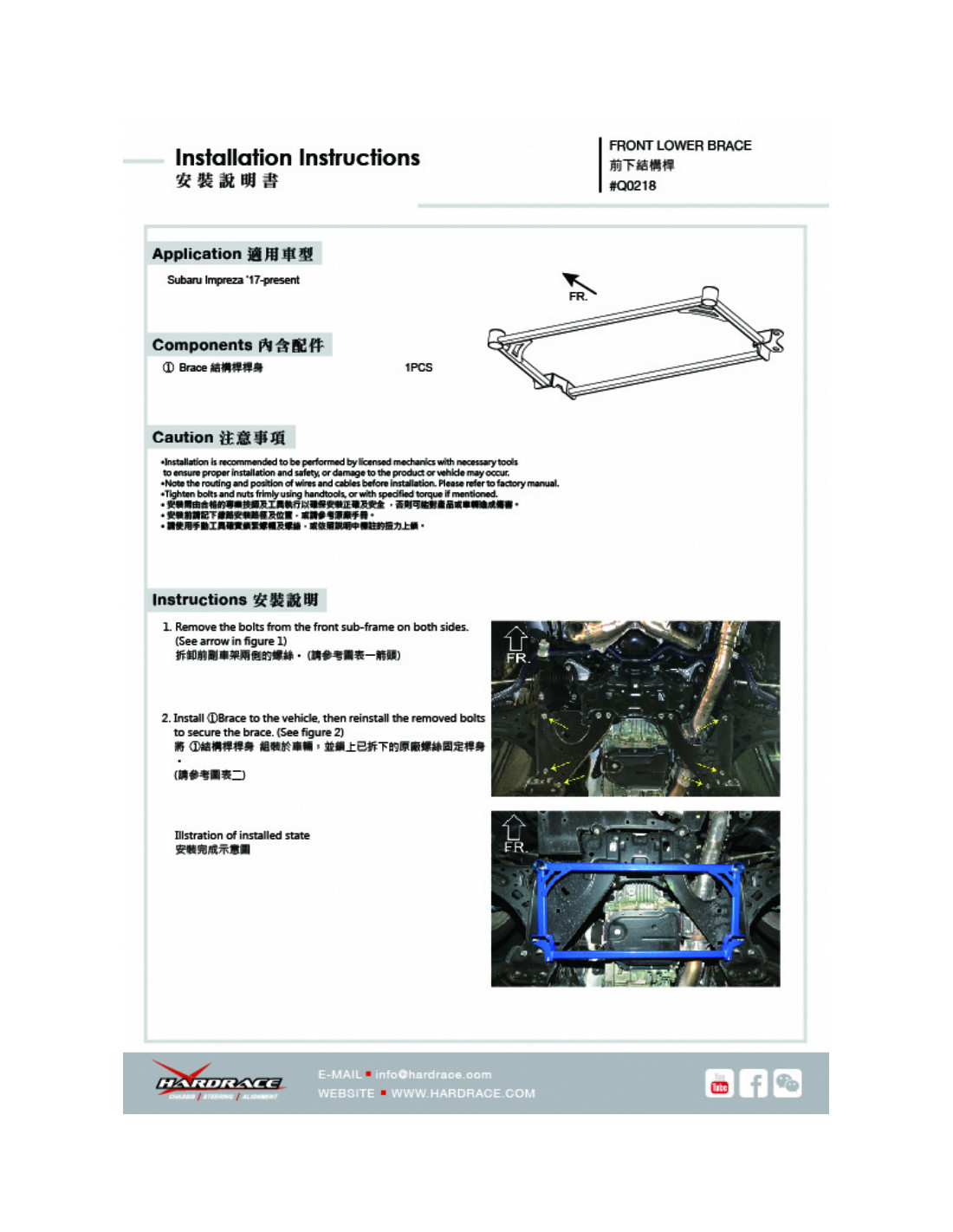Barra rinforzo Hardrace per Subaru Forester, Impreza, XV. Ideale per migliorare la precisione di guida, la stabilità dell'assetto e la risposta dello sterzo. Caratteristiche dal produttore : - 1 PCS/SET