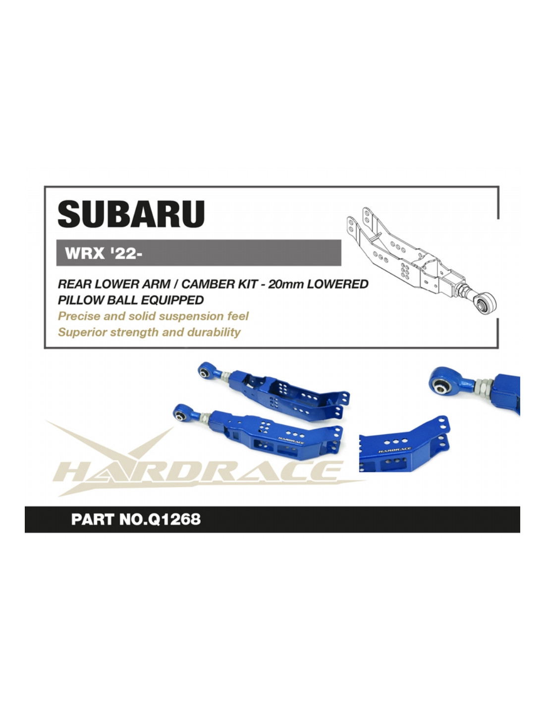 Braccio sospensione Hardrace per Subaru WRX. Ideale per migliorare la precisione di guida, la stabilità dell'assetto e la risposta dello sterzo. Caratteristiche dal produttore : - For Extreme Lowering (20/40mm Dropped) Pillow Ball Equipped 2 PCS/SET