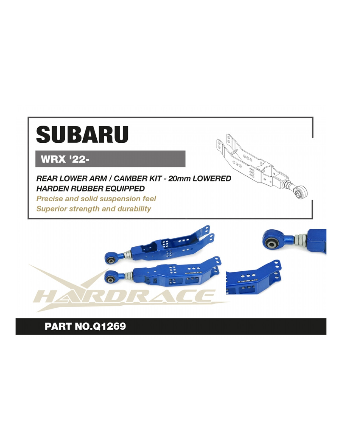 Braccio sospensione Hardrace per Subaru WRX. Ideale per migliorare la precisione di guida, la stabilità dell'assetto e la risposta dello sterzo. Caratteristiche dal produttore : - For Extreme Lowering (20/40mm Dropped) Harden Rubber Equipped 2 PCS/SET