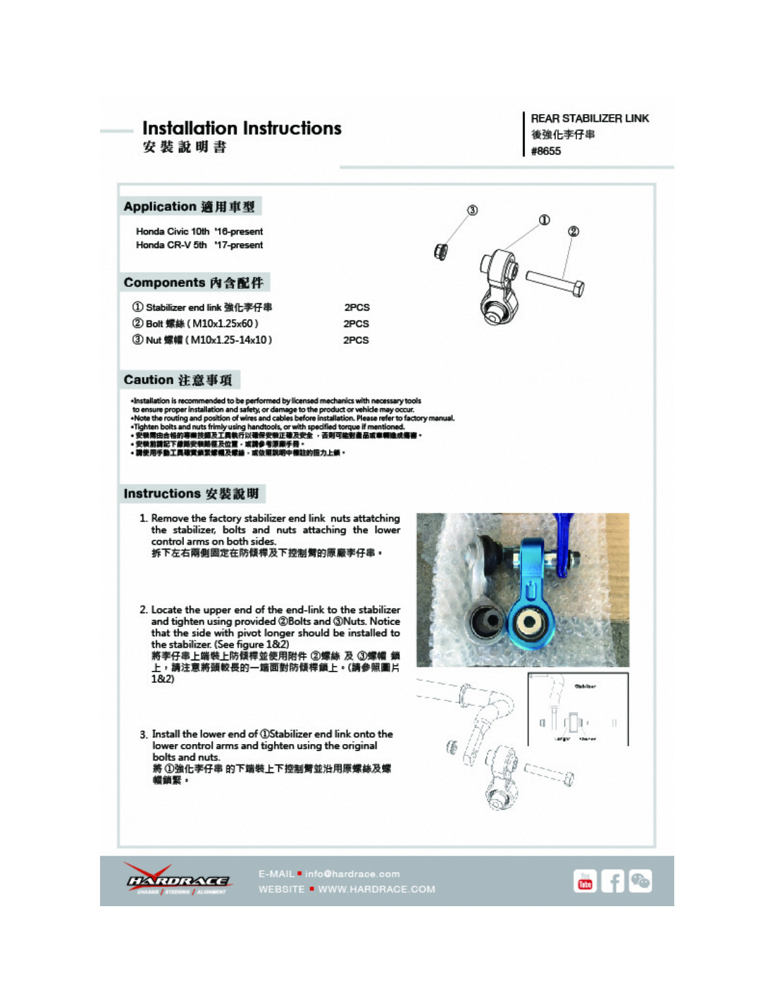 Bielletta barra stabilizzatrice Hardrace per Honda Civic, CR-V. Ideale per migliorare la precisione di guida, la stabilità dell'assetto e la risposta dello sterzo. Caratteristiche dal produttore : - CNC Aluminum Body + Pillow Ball * For 2WD Use Only 2 PCS/SET
