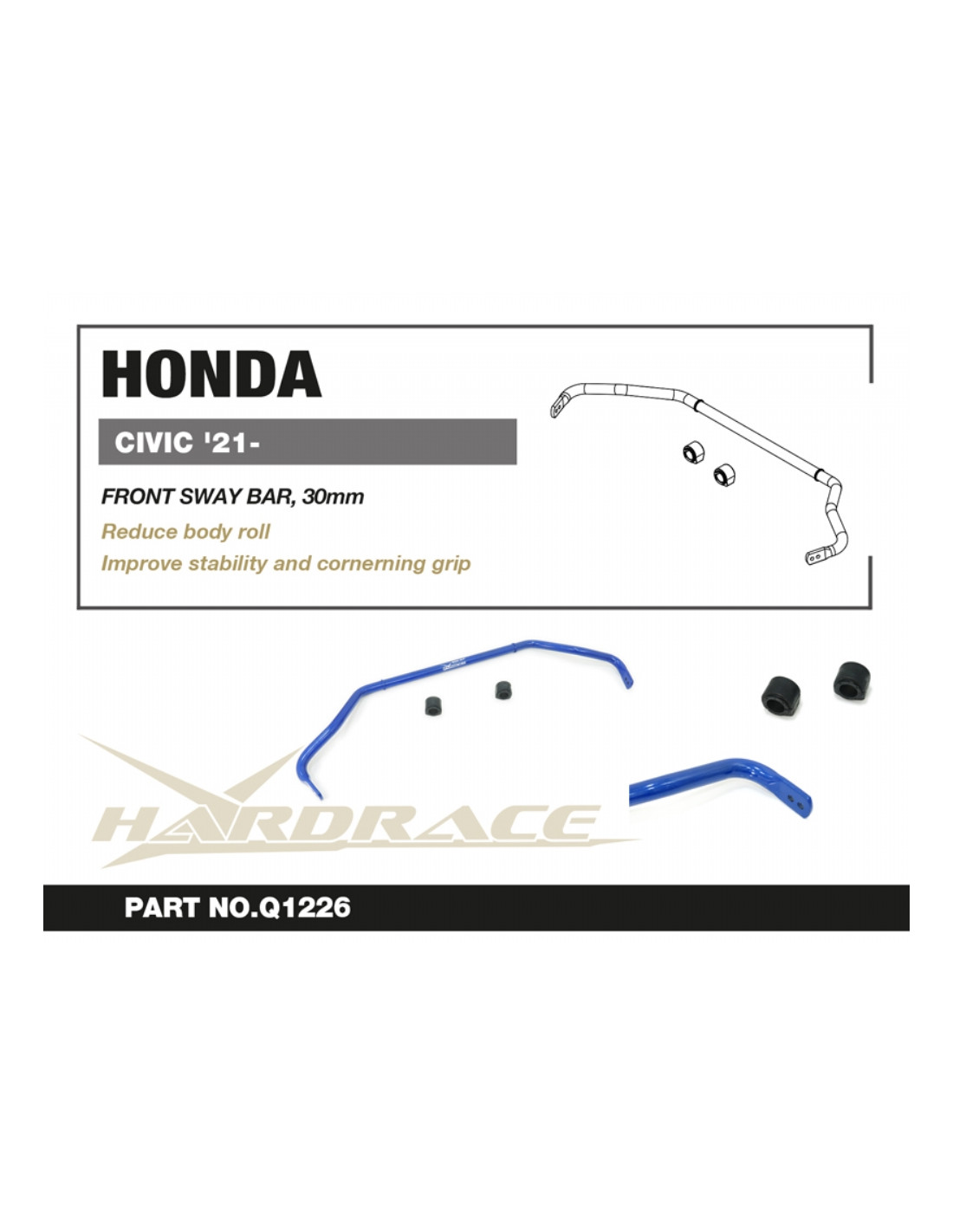 Barra stabilizzatrice Hardrace per Honda Civic. Ideale per migliorare la precisione di guida, la stabilità dell'assetto e la risposta dello sterzo. Caratteristiche dal produttore : - 30 mm 2-Way Adjustable 3 PCS/SET