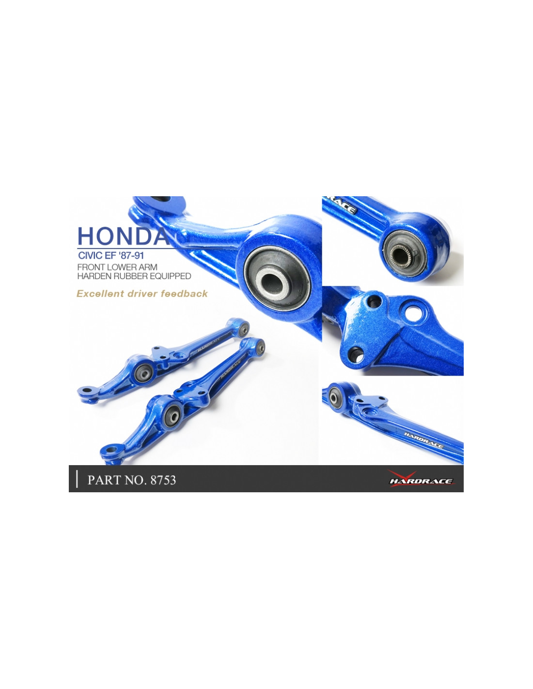 Braccio sospensione Hardrace per Honda Civic. Ideale per migliorare la precisione di guida, la stabilità dell'assetto e la risposta dello sterzo. Caratteristiche dal produttore : - Harden Rubber Equipped. *Not for SIR (EF8/EF9) Use 2 PCS/SET