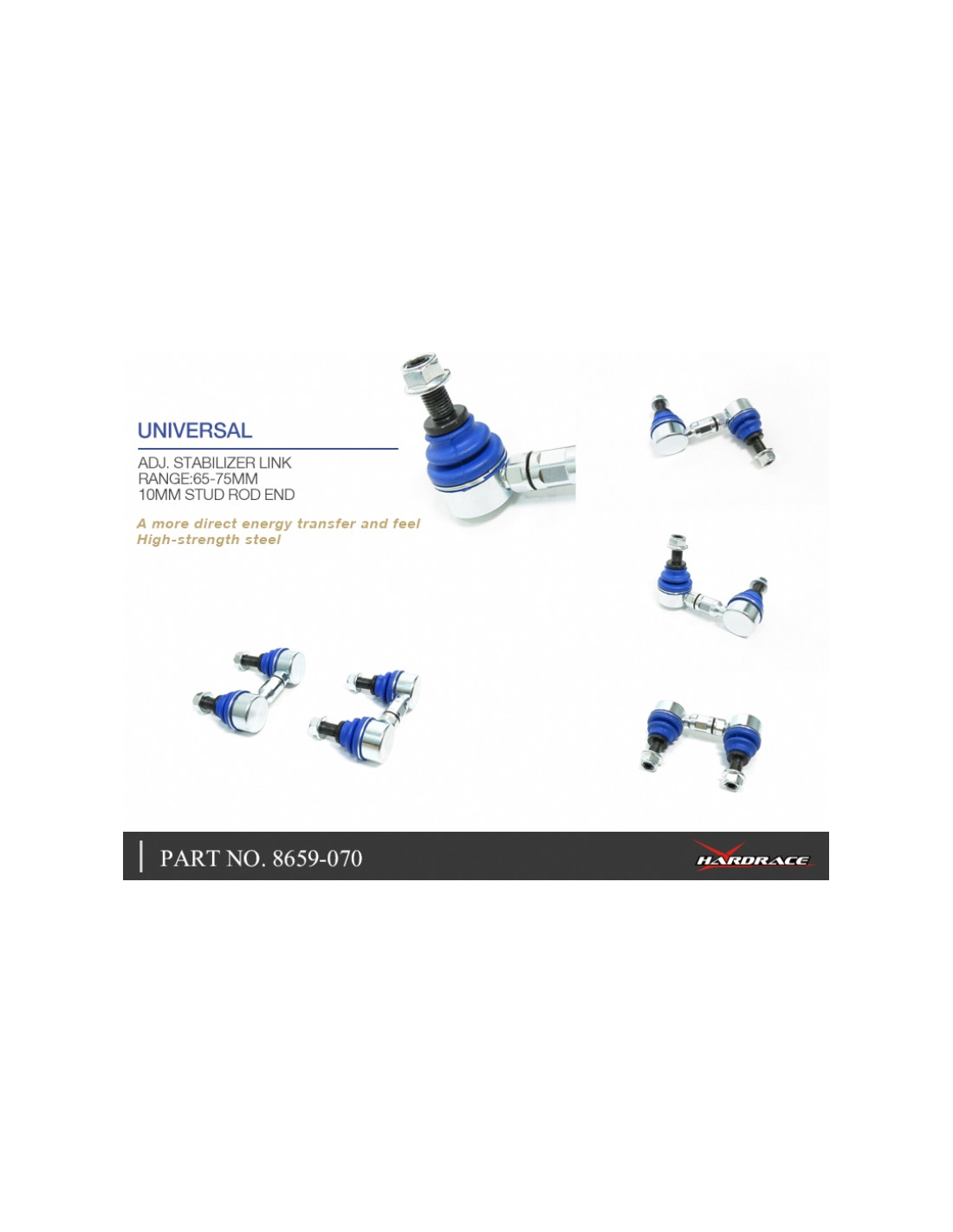 Bielletta barra stabilizzatrice Hardrace per Honda Civic. Ideale per migliorare la precisione di guida, la stabilità dell'assetto e la risposta dello sterzo. Caratteristiche dal produttore : - Range: 65-75 mm Ball stud: M10 2 PCS/SET