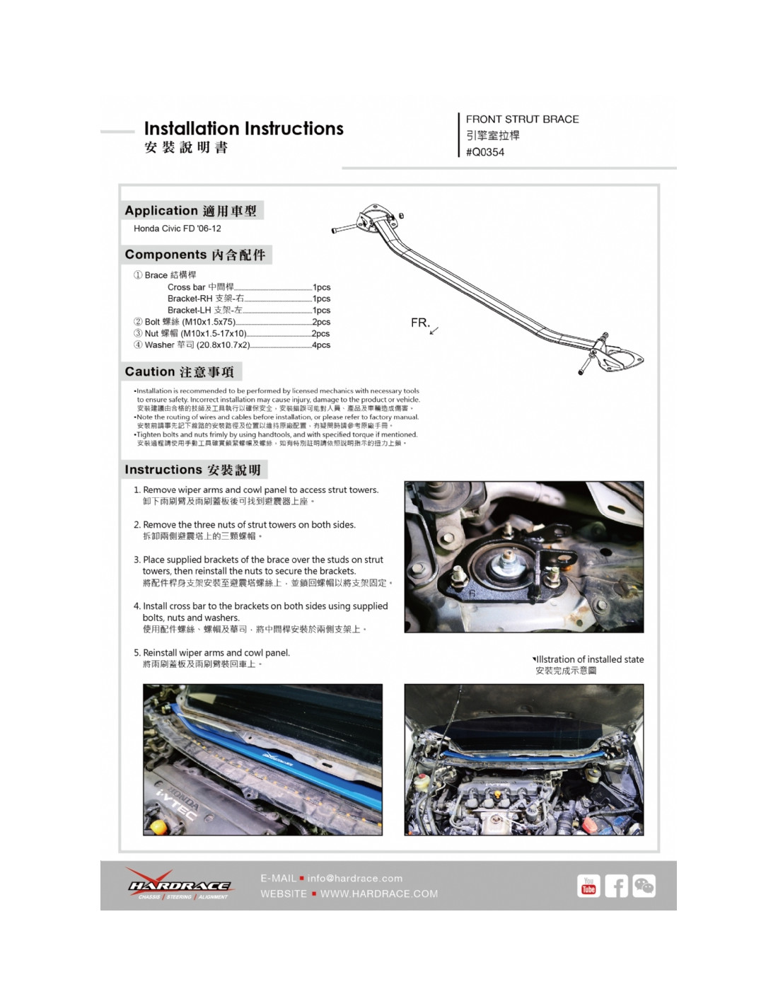 Barra rinforzo Hardrace per Honda Civic. Ideale per migliorare la precisione di guida, la stabilità dell'assetto e la risposta dello sterzo. Caratteristiche dal produttore : - 1 PCS/SET