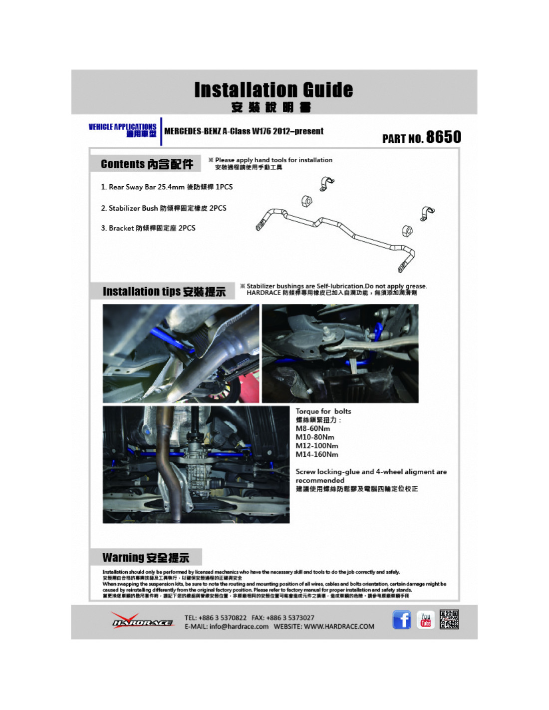 Barra stabilizzatrice Hardrace per Infiniti Q30, Mercedes A-class, Cla-class, Gla-class. Ideale per migliorare la precisione di guida, la stabilità dell'assetto e la risposta dello sterzo. Caratteristiche dal produttore : - HARDRACE: 25.4 mm OE: 22 mm 5 PCS/SET *FOR 4WD 2016- USE