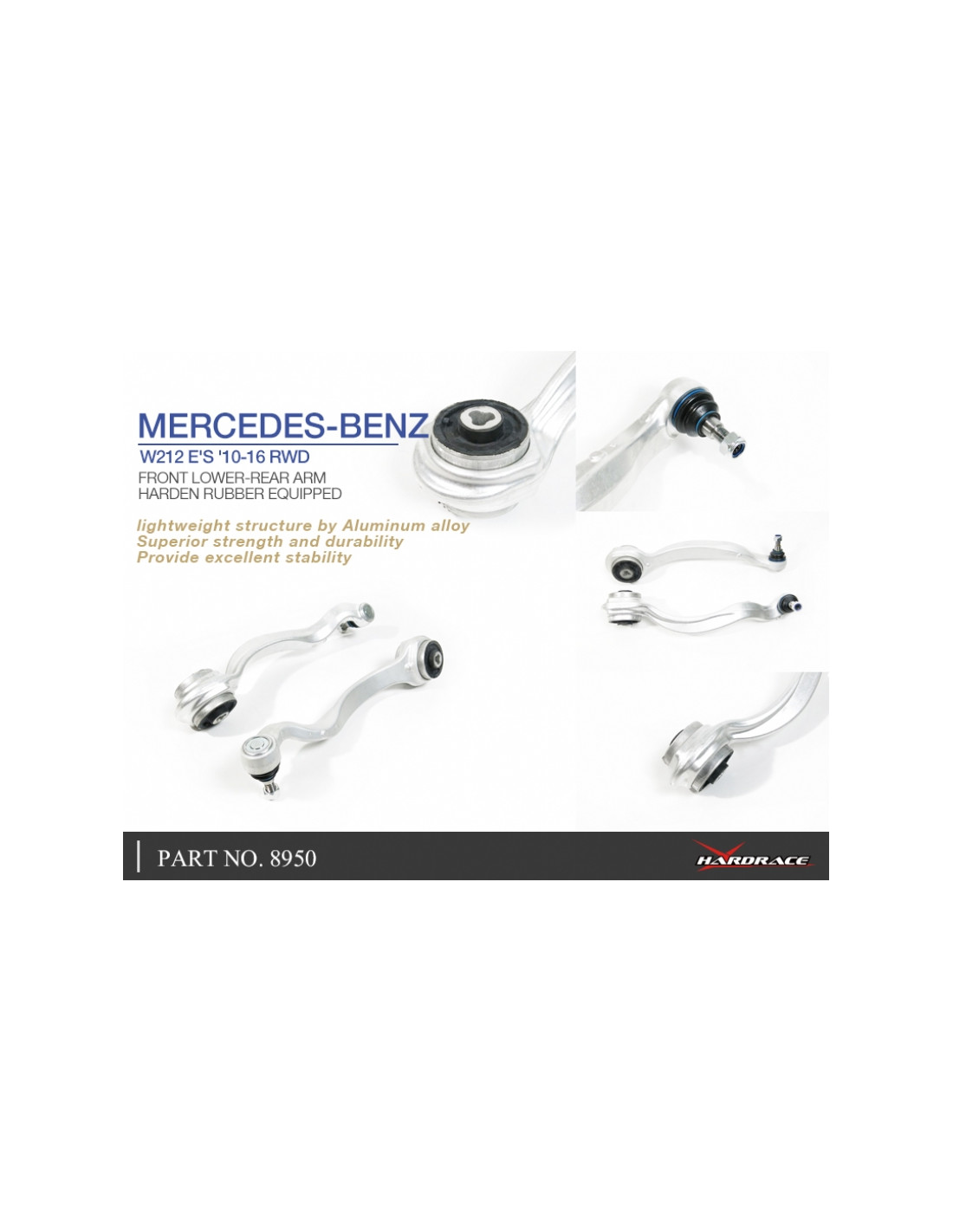 Braccio sospensione Hardrace per Mercedes E-class. Ideale per migliorare la precisione di guida, la stabilità dell'assetto e la risposta dello sterzo. Caratteristiche dal produttore : - Harden Rubber Equipped Aluminum Arm *For RWD Models Only 2 PCS/SET