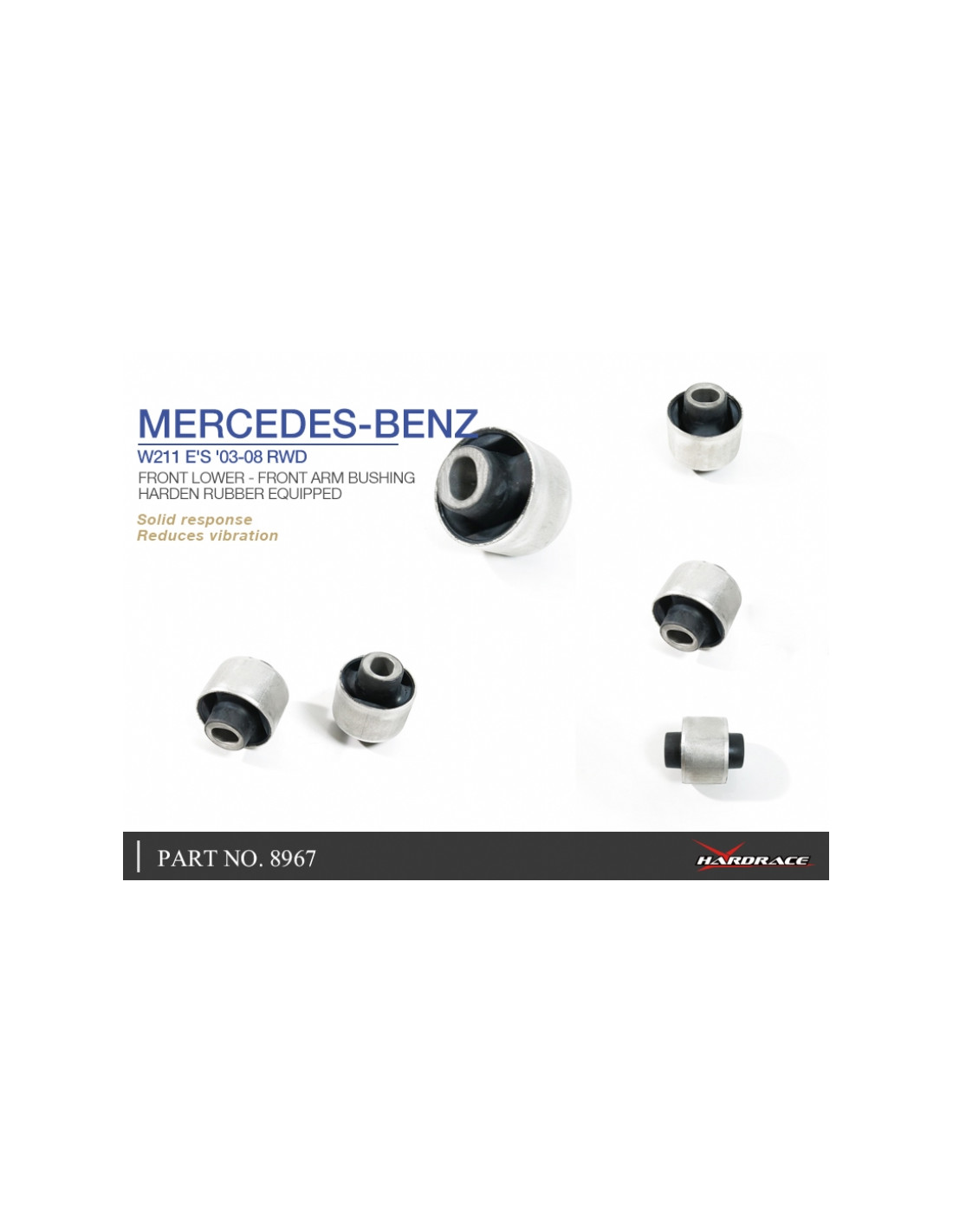 Silent block Hardrace per Mercedes E-class. Ideale per migliorare la precisione di guida, la stabilità dell'assetto e la risposta dello sterzo. Caratteristiche dal produttore : - Harden Rubber Equipped. 2 PCS/SET
