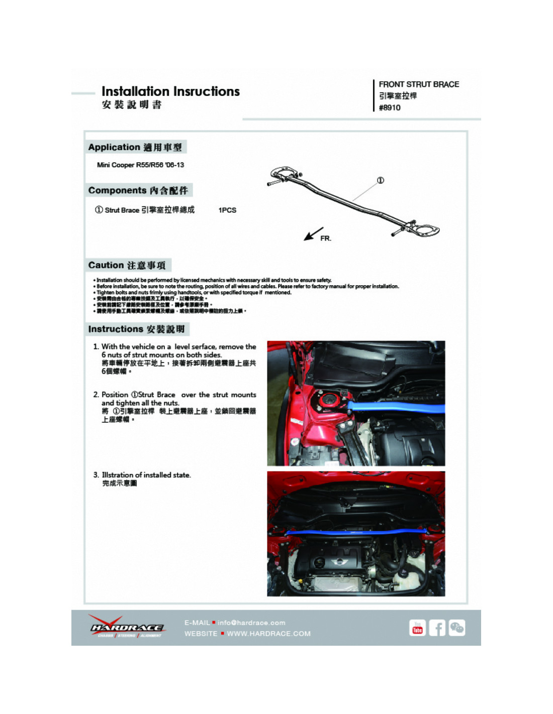 Barra rinforzo Hardrace per Mini Cooper. Ideale per migliorare la precisione di guida, la stabilità dell'assetto e la risposta dello sterzo. Caratteristiche dal produttore : - 1 PCS/SET