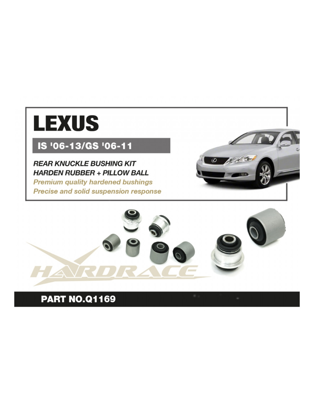 Silent block Hardrace per Lexus GS, IS. Ideale per migliorare la precisione di guida, la stabilità dell'assetto e la risposta dello sterzo. Caratteristiche dal produttore : - Pillow Ball + Harden Rubber 6 PCS/SET